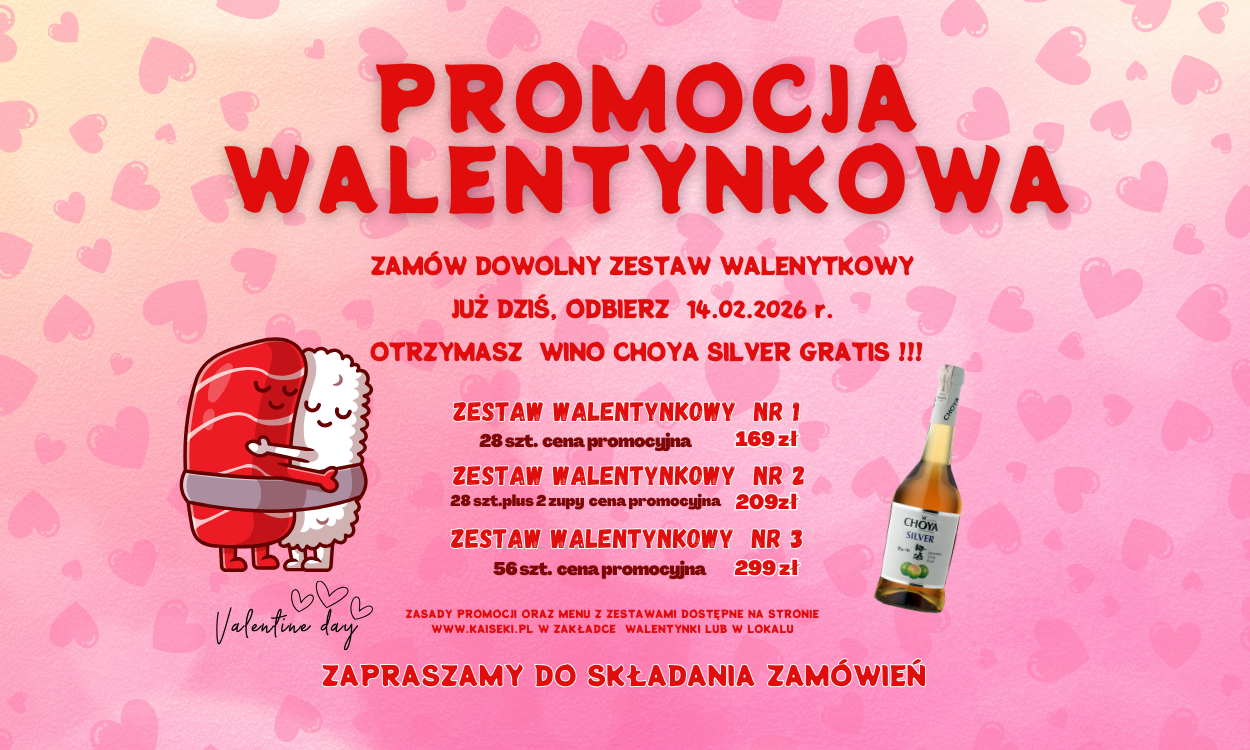 NA DOWOLNY ZESTAW WALENTYNKOWy – UZYSKASZ CENĘ PROMOCYJNĄ ORAZ GRATIS WINO CHOYA SILVER 0,5L*